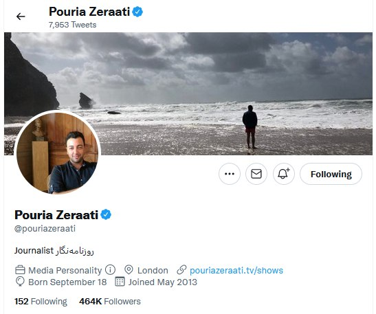مجری سابق شبکه منوتو و مجری کنونی ایران اینترنشنال یکی دیگر از فعالان توئیتری است که به انتشار اخبار ضد و نقیض و نه چندان موثق در میان اهالی توئیتر شهرت دارد. پوریا زراعتی که فعالترین چهره رسانهای در این دوران در میان اشخاص مورد بررسی این گزارش بوده، ۷۵۳ توئیت در این مدت منتشر کرده که معادل ۹ درصد کل توئیتهایش یعنی ۷ هزار و ۹۵۳ توئیت بوده است.
