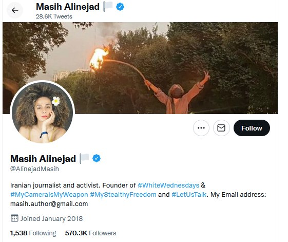 مسیح علینژاد از نظر میزان دنبالکننده، پرفالوئرین چهره بررسی شده در این گزارش است که حجم بالای دنبالکننده در کنار میزان بالای محتوا در توئیتر، از علینژاد چهرهای شناختهشده در توئیترفارسی ساخته است. او که در دوران ناآرامیها ۷۰۵ توئیت منتشر کرده معادل ۲ درصد از کل توئیتهای حساب توئیتریش(۲۸ هزار و ۶۰۰ توئیت) را در این دوره زمانی منتشر کرده است.