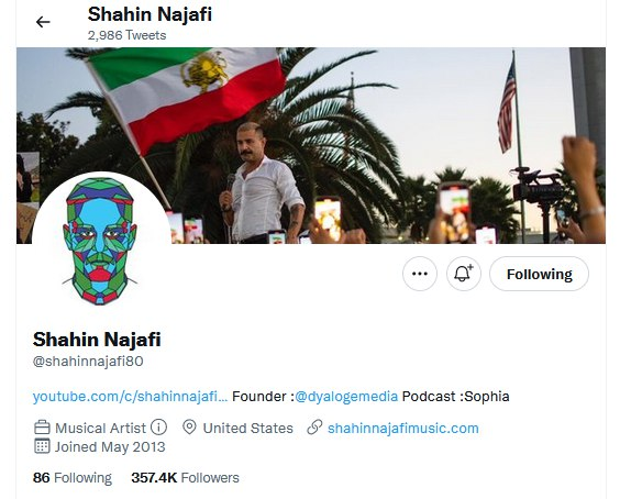 «مرتضی نجفی پورمقدم» که با نام شاهین نجفی شناخته میشود، یکی دیگر از چهرههای فعال و حامی اغتشاشهای شهریورماه است که در دوره زمانی ۲۰ روزه تهیه این گزارش، ۸۰ توئیت و معادل ۲ درصد کل توئیتهای حساب توئیتری (۲۹۸۶) خود را منتشر کرده است.