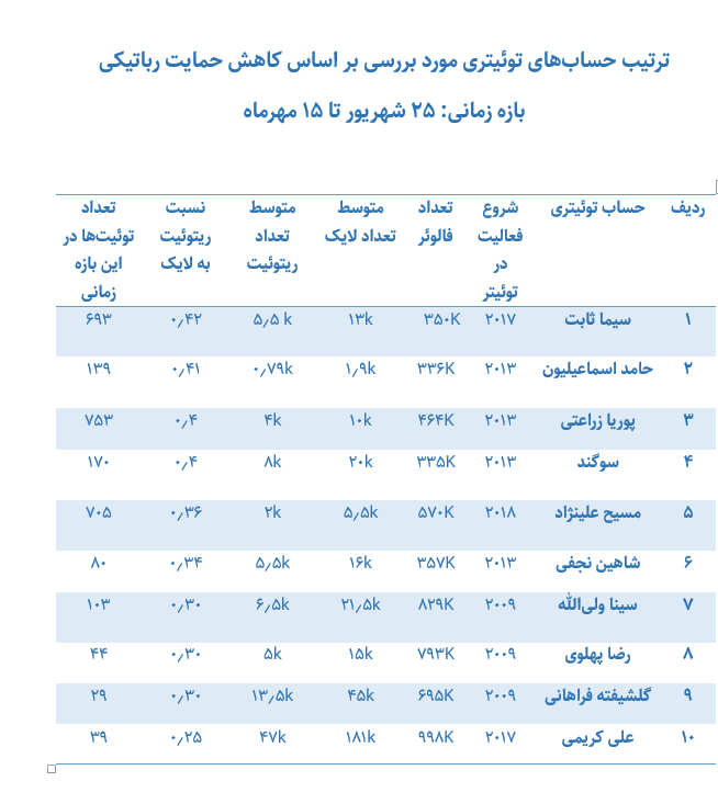 با توجه به حضور حداکثری رباتها در لحظات و ساعات اولیه انتشار توئیتها، واکاوی آخرین توئیتها به نتیجه حداقلی تعداد رباتها خواهد انجامید. به بیان واضحتر، روش استفادهشده در این گزارش موجب کشف تقریبی حداقل رباتها در حسابهای توئیتری مورد نظر شده است( نکته مهم اینکه اطلاعات حسابها در شهریورماه و مهرماه ۱۴۰۱ استخراج و ثبت شده است).